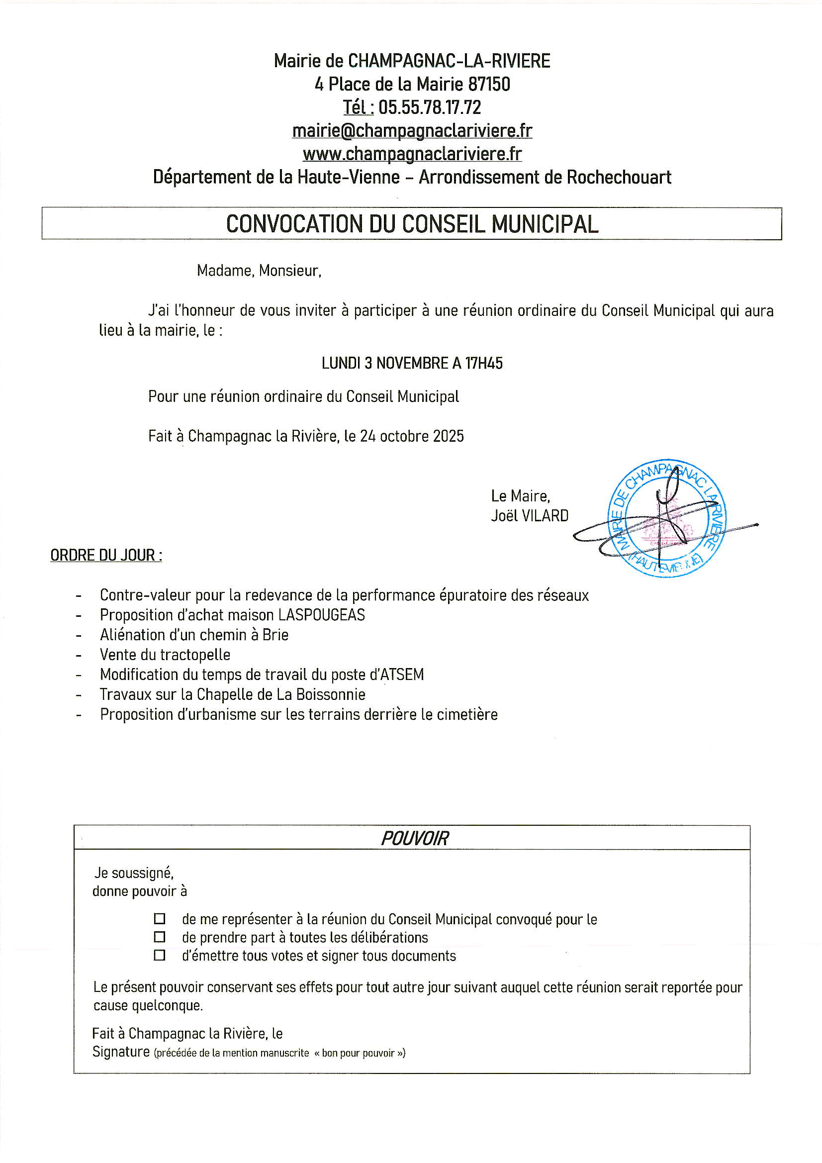Le prochain Conseil Municipal est prévu le 3 novembre 17h45 à la salle des fêtes